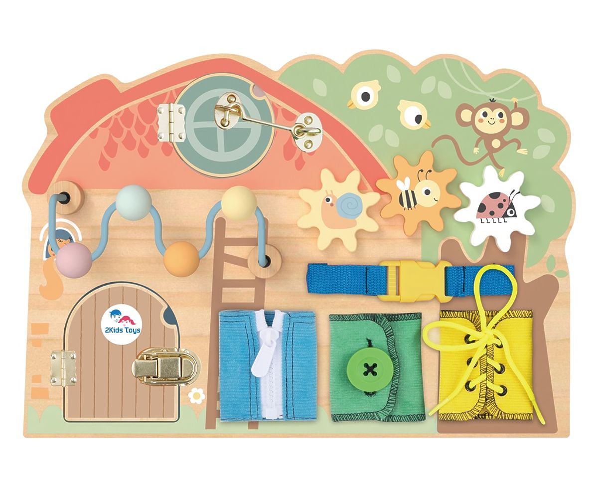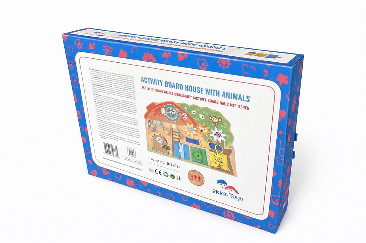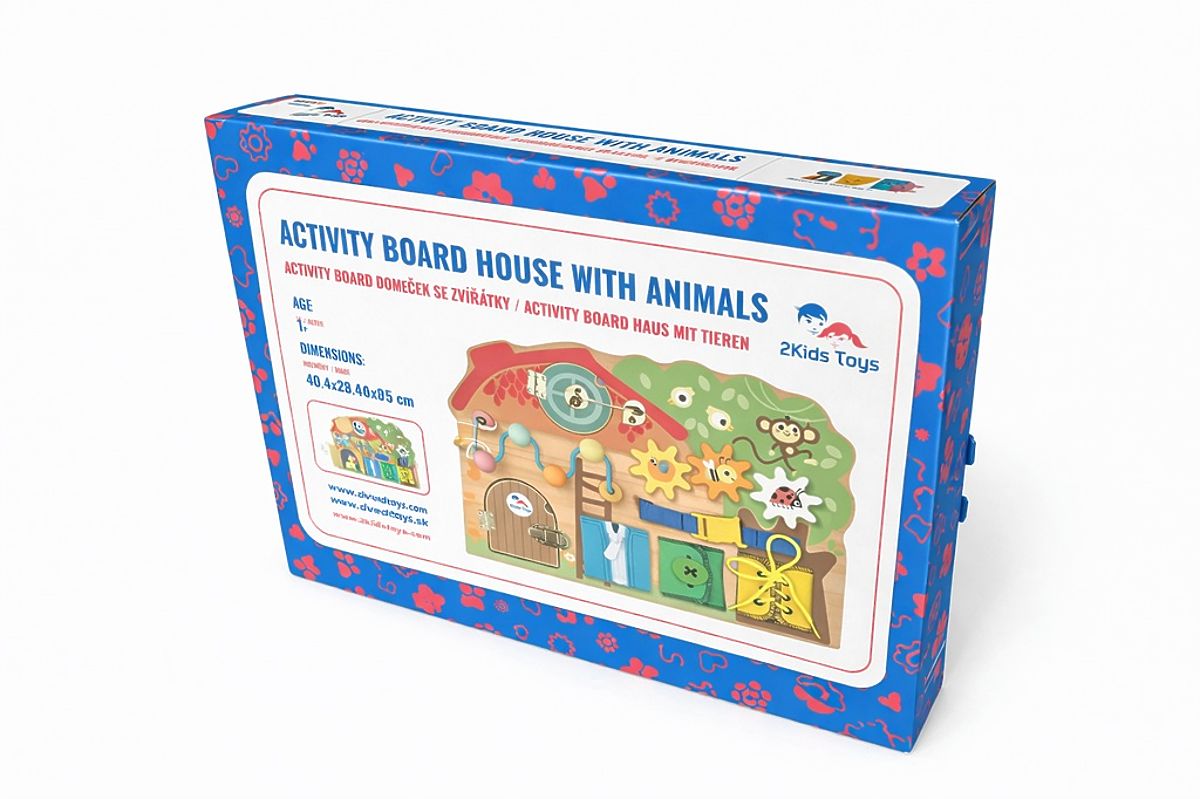 From locks to shoelaces! This activity board with animal pictures offers plenty of fun, allowing your child to develop their dexterity, curiosity, and especially fine motor skills. Locks, a maze, a zipper, shoelaces, and other activities give the child the opportunity to practice various tying, connecting, turning, or opening skills, preparing them for everyday tasks. The activity board is made of FSC® certified wood. Main features: supports independence, fine motor skills, and hand-eye coordination, encourages creative thinking and imagination, sensory stimulation, education through play, made of FSC® certified wood. The FSC® (Forest Stewardship Council) brand and certificate ensure that the wood from which the product is made was not harvested illegally and comes from forests managed in an environmentally friendly or nature-friendly way, where strict environmental and social requirements are met. The FSC® label on the product means that by purchasing it, you help protect forests and support sustainable, responsible, or nature-friendly management, making our forests more stable, healthier, with a natural species composition, and better able to withstand the negative impacts of climate change.