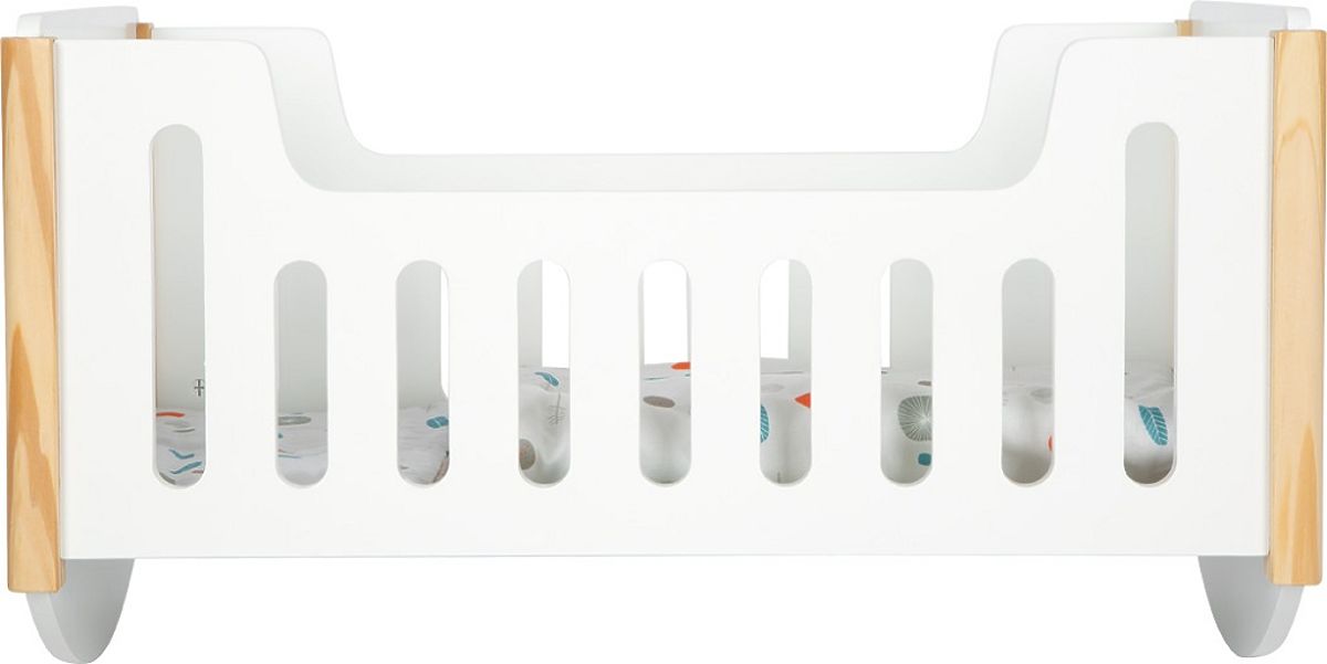 This modern wooden cradle in Scandinavian design is the ideal bed with the possibility of gentle rocking for dolls or plush animals. The package includes a pillow and a large duvet, which are covered in color-neutral, reversible bedding. Additionally, the duvet is large enough to comfortably cover dolls or plush toys up to 46 cm in size. High-quality, stable construction, rounded edges, and soft color tones make the cradle a stylish and quality piece. A perfect toy for any children's room. The package includes: 1x bed, 1x pillow, 1x blanket. Main features: wooden cradle and bed in one, oversized blanket, reversible bedding, robust construction, quality craftsmanship, rounded edges, for dolls and plush toys up to 46 cm, Scandinavian design, soft color tones. Little Button The range of attractive accessories for Little Button dolls offers a wide array of products, from strollers to high chairs to wardrobes. Customers are easily captivated by the uniform functional and subtle design utilizing straight lines and modest neutral colors. This allows them to create cohesive harmonious sets that tastefully complement modern interiors. Ingenious construction and quality craftsmanship help ensure high stability, safety, and long-lasting durability. Use them to create a stylish corner for dolls where your children can develop their imagination and caregiving skills.