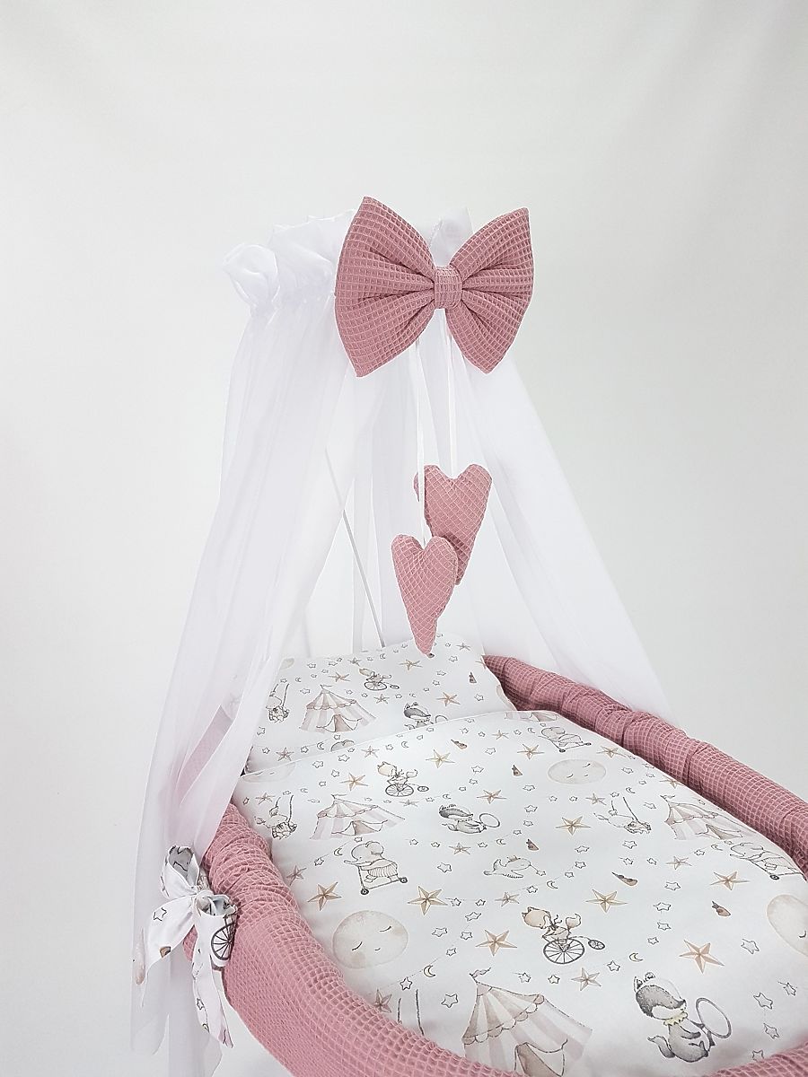 This wicker basket creates a perfect and cozy sleeping place for your baby anywhere in the house. The white basket includes a 5-piece bedding set with a circus motif made from attractive waffle cotton.