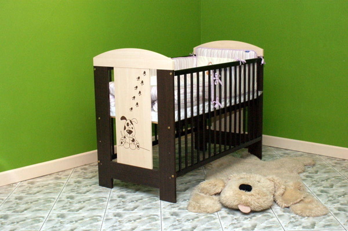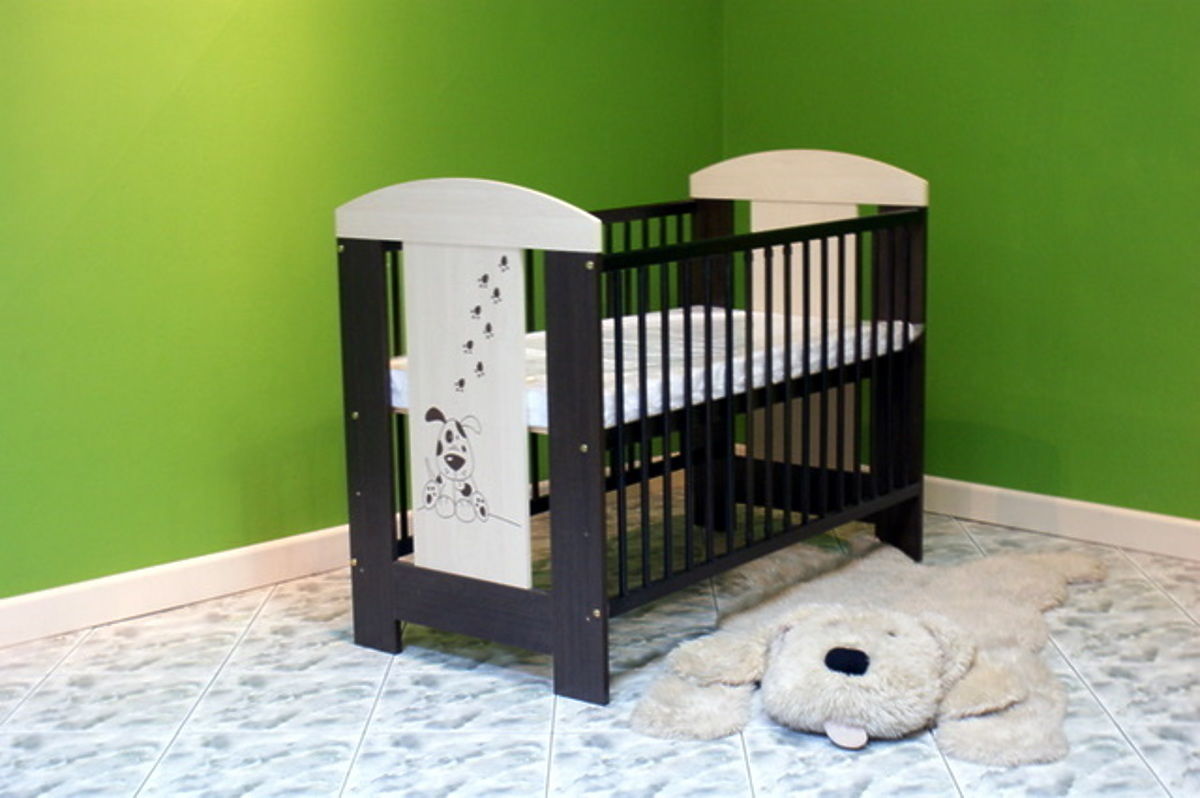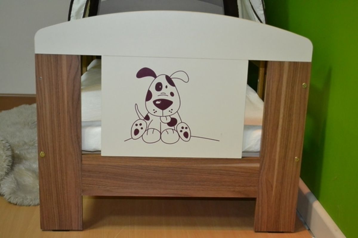 The vanilla-wenge colour combination is very nice and it is complemented with a picture of a dog on the headboard and the footboard. MDF is combined with pine wood here. Inner dimensions are 1240 x 65 x 960 mm.