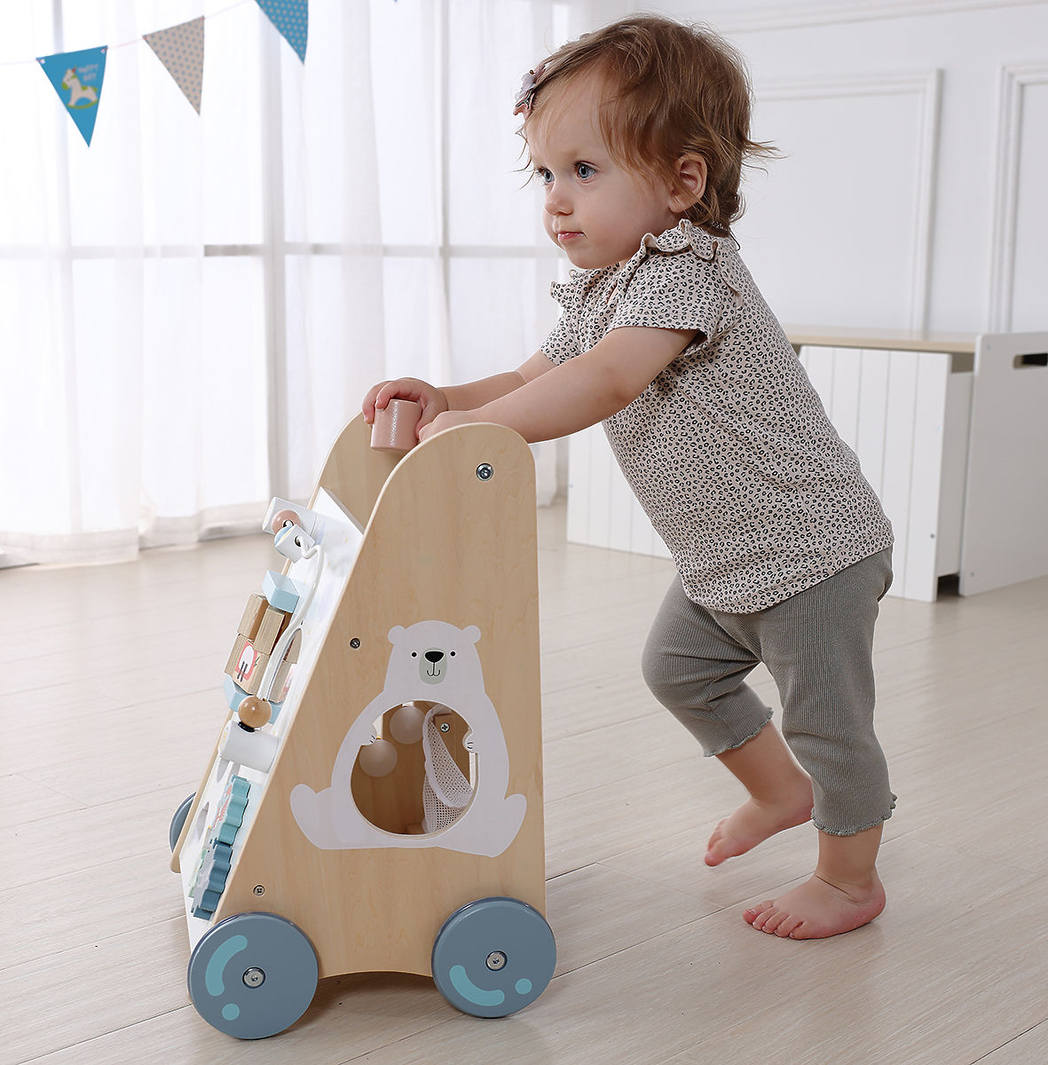 WOODEN WALKER For children from 18 months Supports children in learning to walk Toy made of wood Durable, stable construction Educational panel with movable .. more