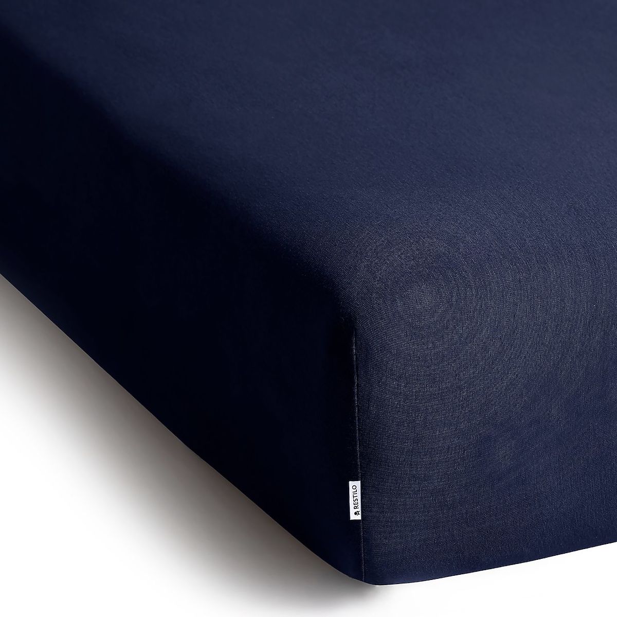 Navy blue fitted sheet in classic style, made from jersey material. .. more