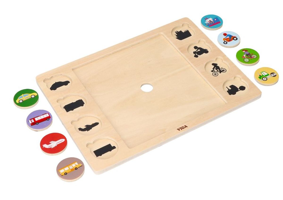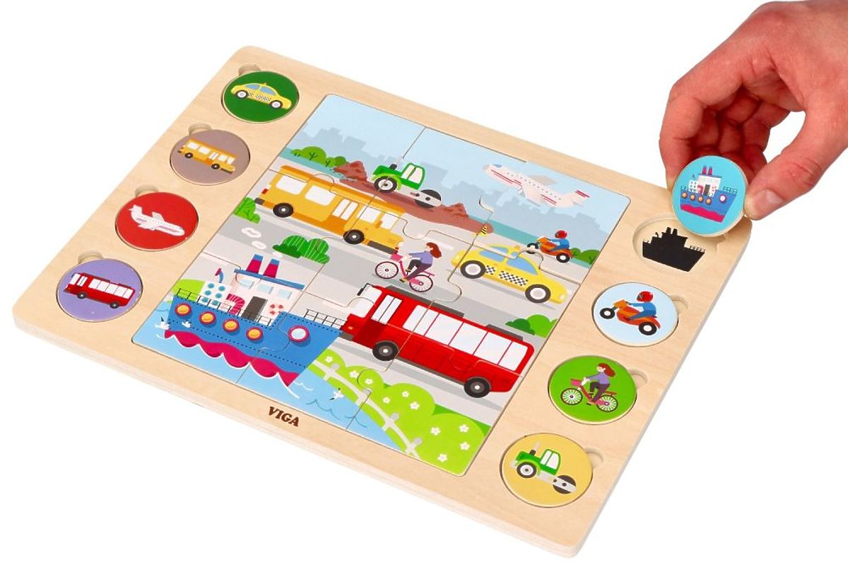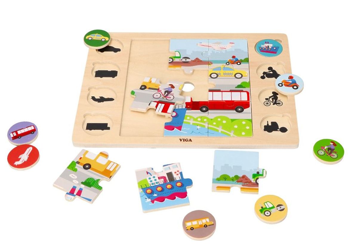 The game begins with assembling a 9-piece puzzle placed in the center. Then, the child can match 8 round puzzle pieces to the corresponding shadows on the board. This task develops manual skills and coordination, as well as logical thinking. After correctly matching all the elements, the child can name the individual vehicles and find them on the large assembled picture. It's an excellent way to develop vocabulary and build logical thinking skills.