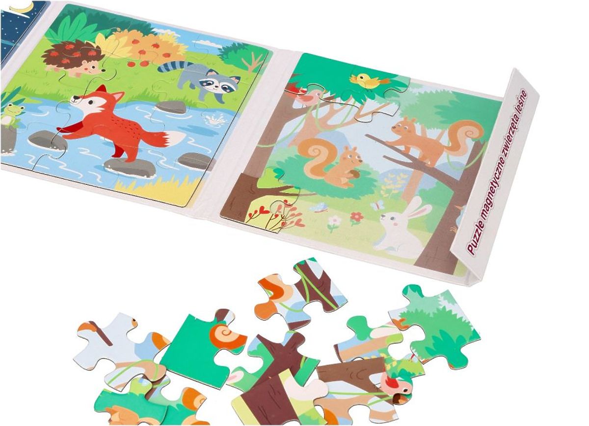 Beloved forest animals return to us in a new form. Hedgehog, fox, deer, squirrel, or bunny? Which animal will win the heart of our little one? The puzzle, also a magnetic puzzle, is a great toy that develops a child's creativity and imagination. The game can be played in two ways. The first version is assembling puzzles on magnetic boards with a background. The second option is a magnetic board with 11 magnets featuring forest animals. This allows for creating your own stories and scenes with favorite forest animals.