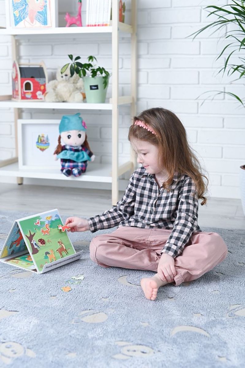 It is beautifully crafted in vibrant colors, further developing artistic sense. The packaging is made of sturdy cardboard in the form of a book. When the book is unfolded and one side is bent, a convenient forest board is created to facilitate play with magnets. Overall, it presents very aesthetically, is packed in an additional box, and is perfect as a gift.