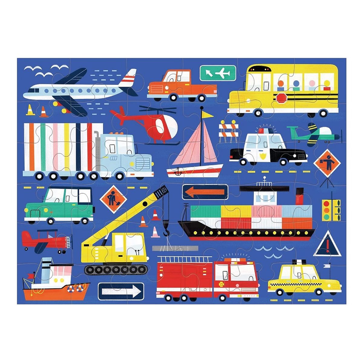 Colorful puzzle with 36 pieces featuring various vehicles. .. more