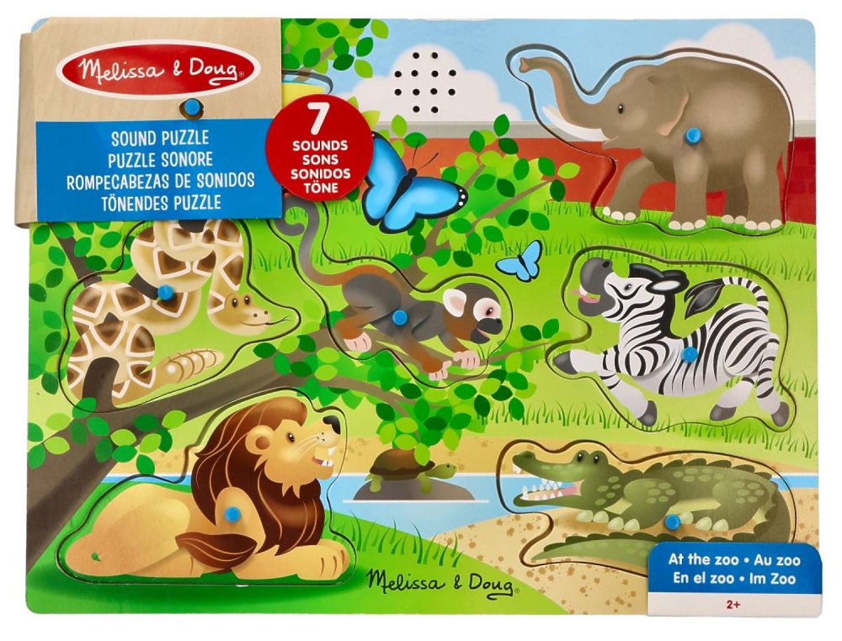 New wooden sound puzzle from Melissa & Doug. The little player matches the pieces to the empty spaces, and upon placing the animal in its spot, hears a .. more