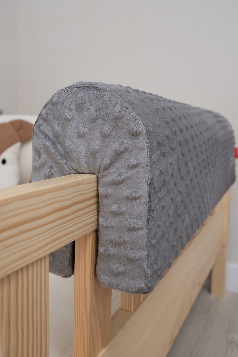 Dark gray bed guard made of polyurethane foam and Minky fabric. .. more