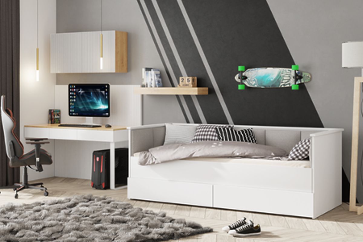 The minimalist design of the HELIOS bed, enriched with upholstered panels made of high-quality velvet material, gives the interior a modern and elegant character. The panels are not only an aesthetic addition but also a practical element that provides comfortable support while reading, watching TV, or studying. The soft and pleasant-to-touch material adds warmth and coziness, enhancing the friendly character of a youth room. Additionally, the bed is equipped with two spacious drawers on ball-bearing slides, allowing for the storage of bedding, clothes, or other small items. This solution not only helps maintain order but also optimally utilizes space, which is especially important in smaller rooms.