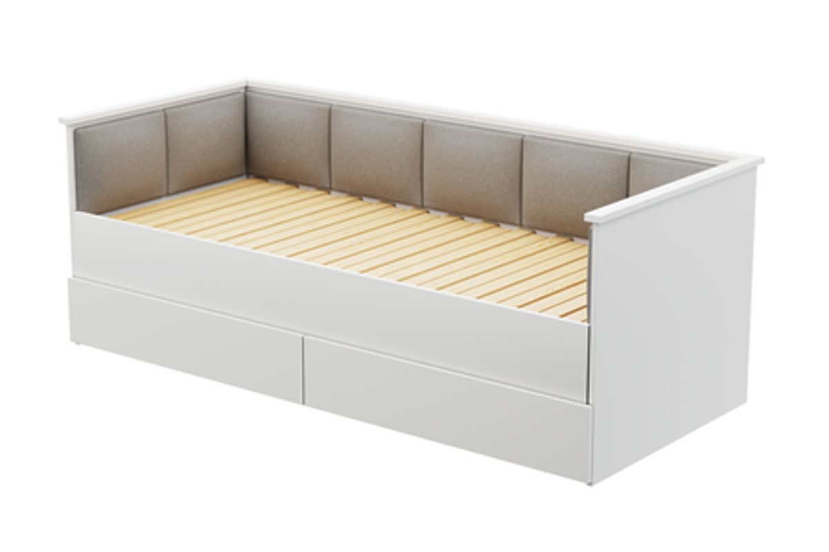 Convertible youth bed HELIOS with grey upholstered panels and spacious drawers. .. more
