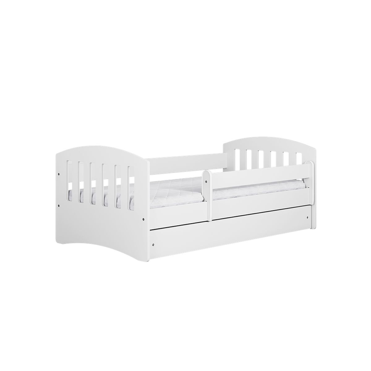Children's Bed Classic in pure white color with a safety rail, slatted base, and storage space included. The elegant white color fits any children's room, whether for boys, girls, or a neutral interior. The entire bed is pure white, including the headboard and sides. If you are looking for a timeless bed for a child's room, you have just found it.