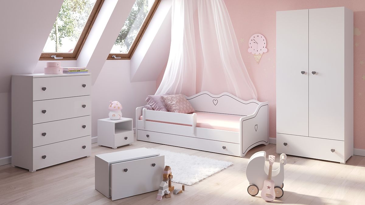 The functionality of the EMMA model is highlighted by a range of practical solutions that make everyday life easier. The bed is equipped with a spacious drawer on wheels, ideal for storing bedding, toys, games, or other items, helping to keep the child's room tidy. Another advantage is the movable protective guardrail, which can be mounted on either side of the bed, increasing its versatility and safety. The bed's construction can support a load of up to 110 kg, allowing it to serve for many years. The use of spring slats in the FLEX system ensures optimal body support, affecting sleep quality. Additionally, the high headboard allows the bed to serve as a comfortable sofa during the day – perfect for reading, playing, or relaxing. This multifunctional solution is suitable for both smaller and larger spaces, fully meeting the needs of children and their parents.