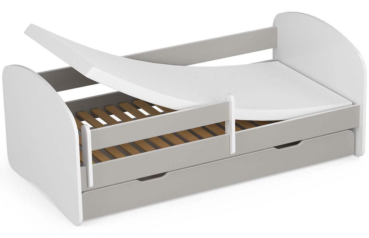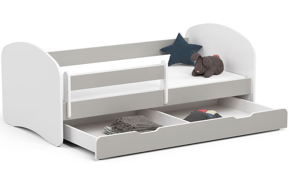 The SMILE bed measures 160x80 cm and comes with a mattress, drawer, and guardrail. A complete bed for a boy or girl in a children's room. Color: Grey. The frame can support a load of up to 100 kg.