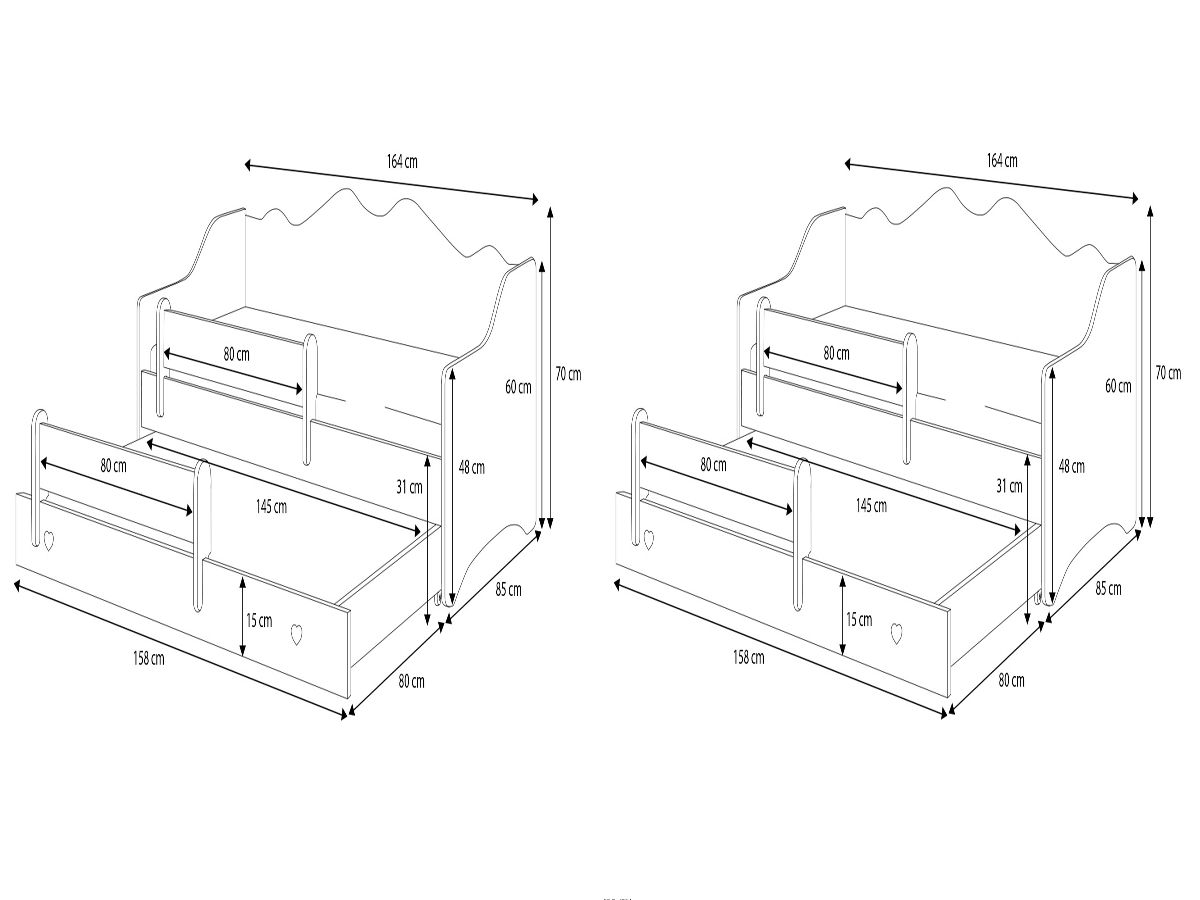 The Kobi Emma children's bed is the perfect solution for parents looking for practical and aesthetic furniture for a child's room. This model features two sleeping areas – the upper one measuring 160x80 cm and the lower one 145x80 cm – making it a great choice for siblings or children who love to invite friends for sleepovers. Delicate details and thoughtful design ensure that the bed harmoniously fits into any interior and becomes its adornment.