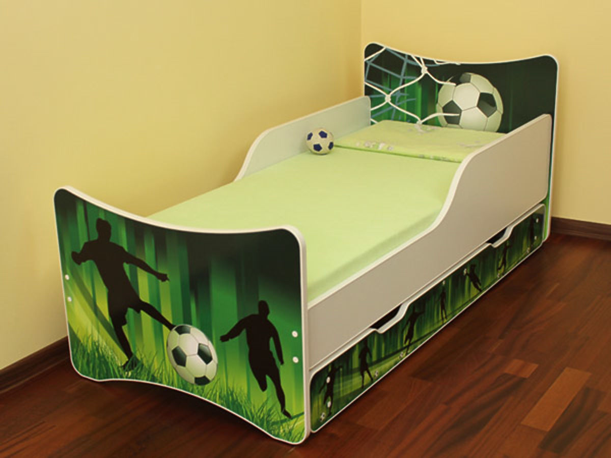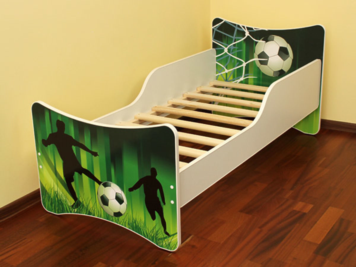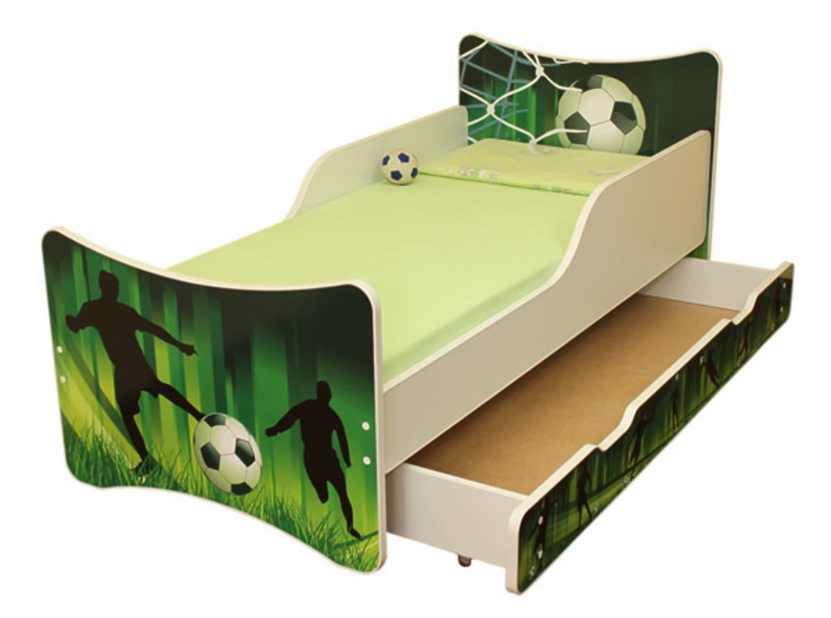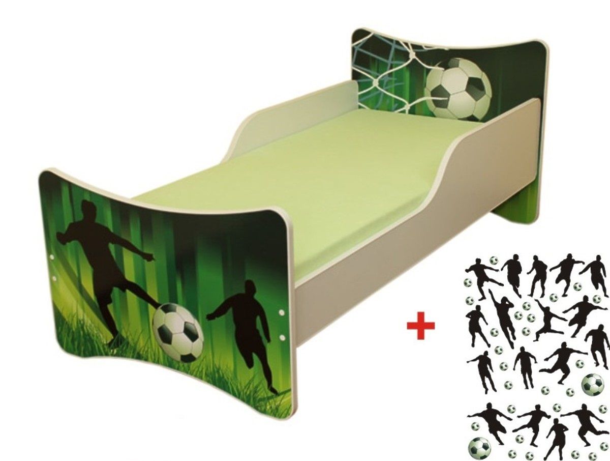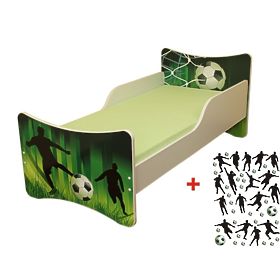 Little football fans will be thrilled about this beautiful children's bed featuring a football motif. A football, football players or a net, all this can be found on the bed. Apart from a beautiful design, the good-quality bed is also durable and robust. Both the headboard and the footboard are printed using eco-friendly ink. The whole print is protected with a laminated profile which prevents the colours from fading out. A special rim covers the sharp edges of the board. The bed uses good-quality materials and features a good-quality finish. Its weight capacity is 150 kg, so parents can sit or lie down on the bed to read their children a story without any worries. Included is a bed base with 2 cm thick slats and a wall sticker decoration to allow you to decorate your children's bedroom to perfection. A mattress is not included but can be purchased separately in the left panel, section MATTRESSES, where you can choose the right one for you.