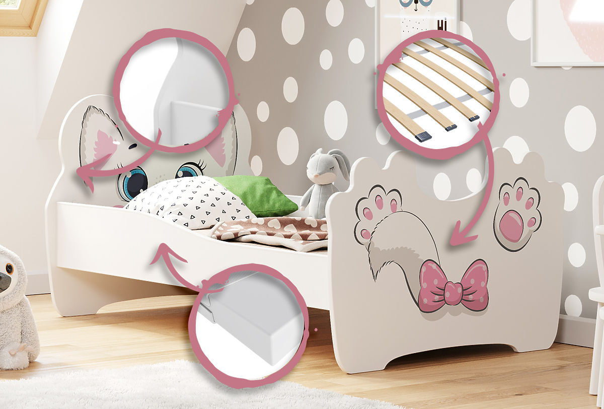 The children's bed with an adorable pink cat print is the perfect solution for a little fan of fairy-tale motifs. The cute pattern on the headboard and footboard makes the furniture not only a place to sleep but also a unique decoration for a child's room. Soft colors and a fairy-tale theme bring a joyful atmosphere to the interior, supporting both relaxation and creative play.