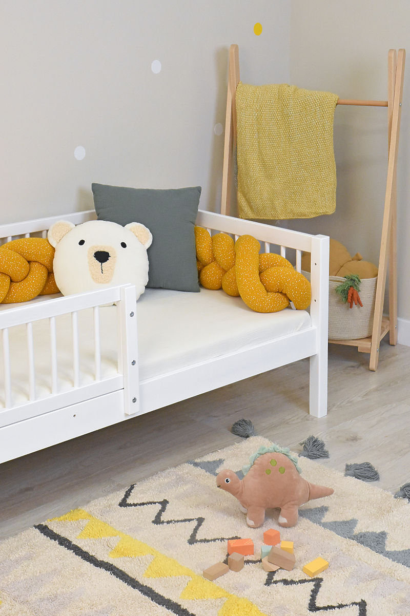 The stylish and practical Teddy children's bed in elegant white color ensures your child a safe and comfortable sleep. The robust construction offers long-lasting durability, and thanks to its thoughtful design, the bed is not only safe but also functional. It easily fits into any children's room.