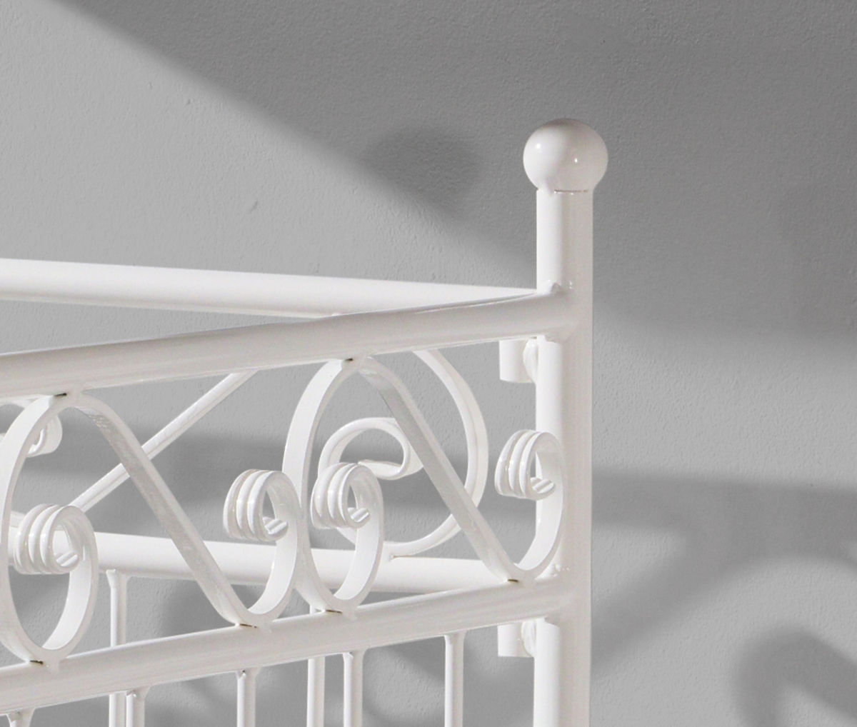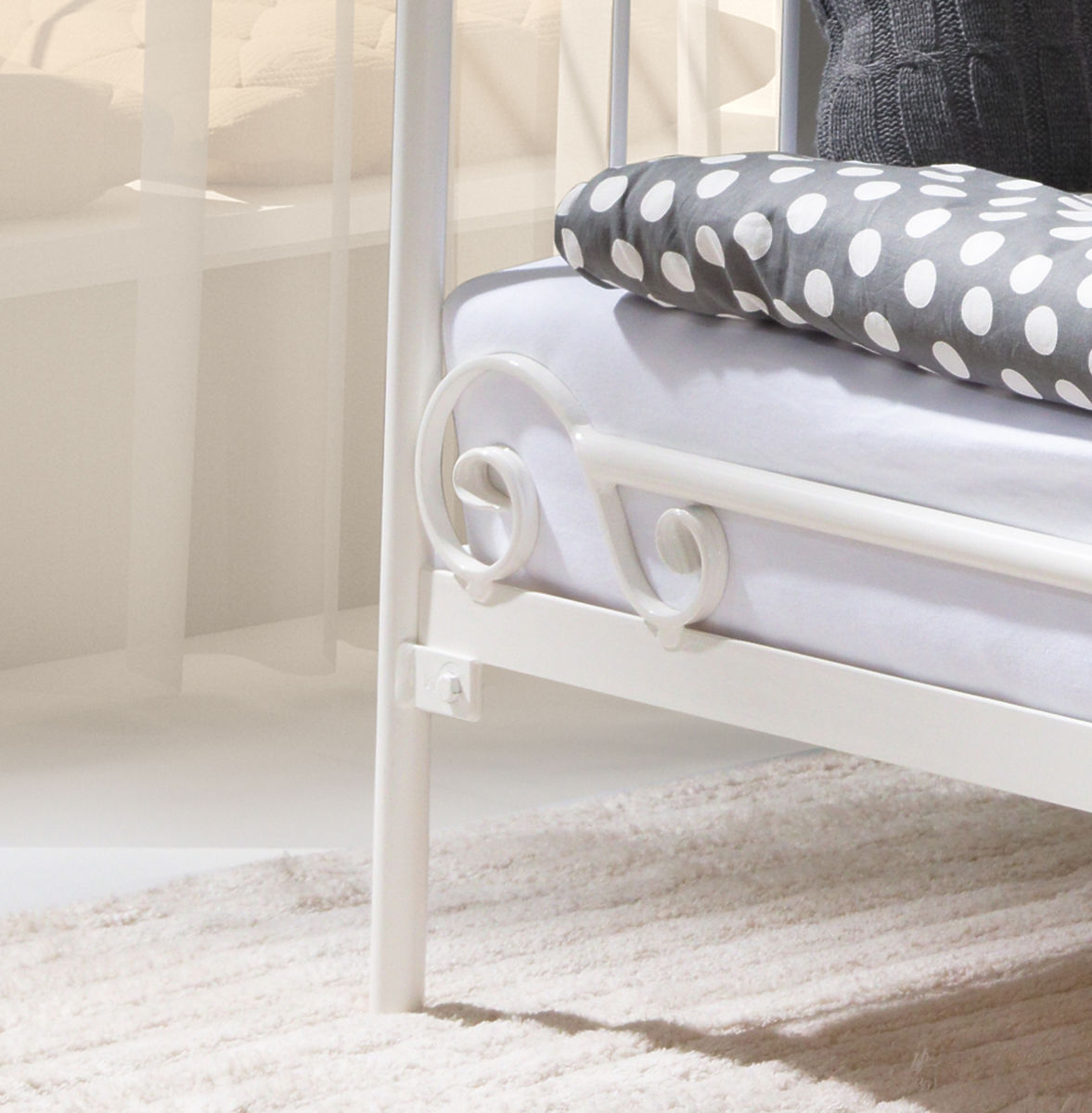 The bed is made from high-quality steel. Its metal frame comprises four parts that are joined with nuts and bolts. The structure is highly sturdy and stable. Its feet are also made of metal tubes 27 mm in diameter and the support rails are 21 mm in diameter. The metal bars are 8 mm in diameter. The bed comes with a wooden slatted bed base but the mattress is not included. It can be found in the panel on the left in the MATTRESS section, where you can select the relevant size. We recommend a 16 cm thickness.