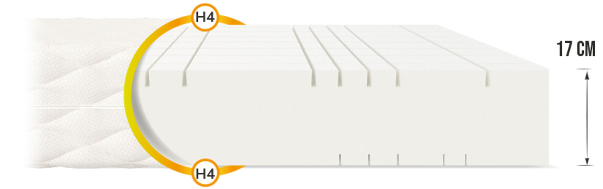 GOYA is a universal foam mattress with a height of 17 cm , which provides quality sleep for the whole family. Its construction is simple, as it was cut from a single piece of foam, and yet it has many advantages. The double-sided mattress is divided into 7 zones thanks to a series of longitudinal and transverse cuts. This leads to a significant increase in plasticity, which provides excellent support for the spine and therefore you will wake up refreshed and full of energy.