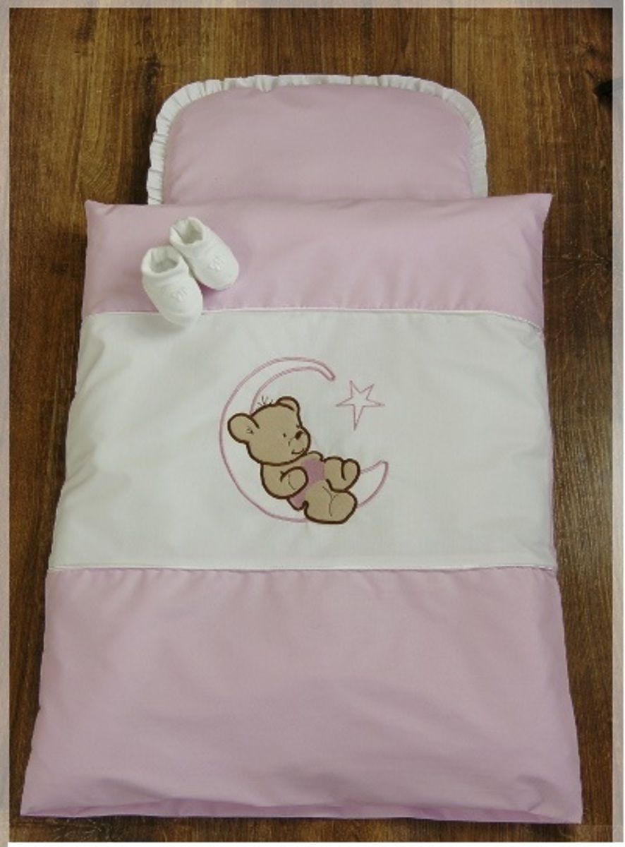 Beautiful 4 piece set bedding with filling in the stroller looks lovely and enlivens every pram. Beautiful teddy bear motif is suitable for all babies. Bright colors, which disposes sheets are vibrant and beautiful. Fade even after many washings. Beautiful set of sheets is made of a material which is pleasant to the touch and feathery, high quality of 100% cotton. Turning the set of sheets is safely hidden lock. Linen has certified ÖKO-TEX. Blanket with a pillow is filled with high-quality filler, which is made of silicone and anti-allergic fibers. Blanket with a pillow have a long service life, maintain an optimal temperature during all seasons. Blankets and pillows may be used throughout the year, it is suitable for each baby. Set performs a certificate of quality and safety ÖKO-TEX Standard 100 certified fabrics has also "Safety for Children". Your child will be perfectly safe. The 4 - piece bedding set includes: - Pillow with dimensions of 30 x 35 cm - duvet covers with embroidered teddy bear with dimensions of 70 x 55 cm - Cushion 30 x 35 cm - blanket measuring 70 x 55 cm