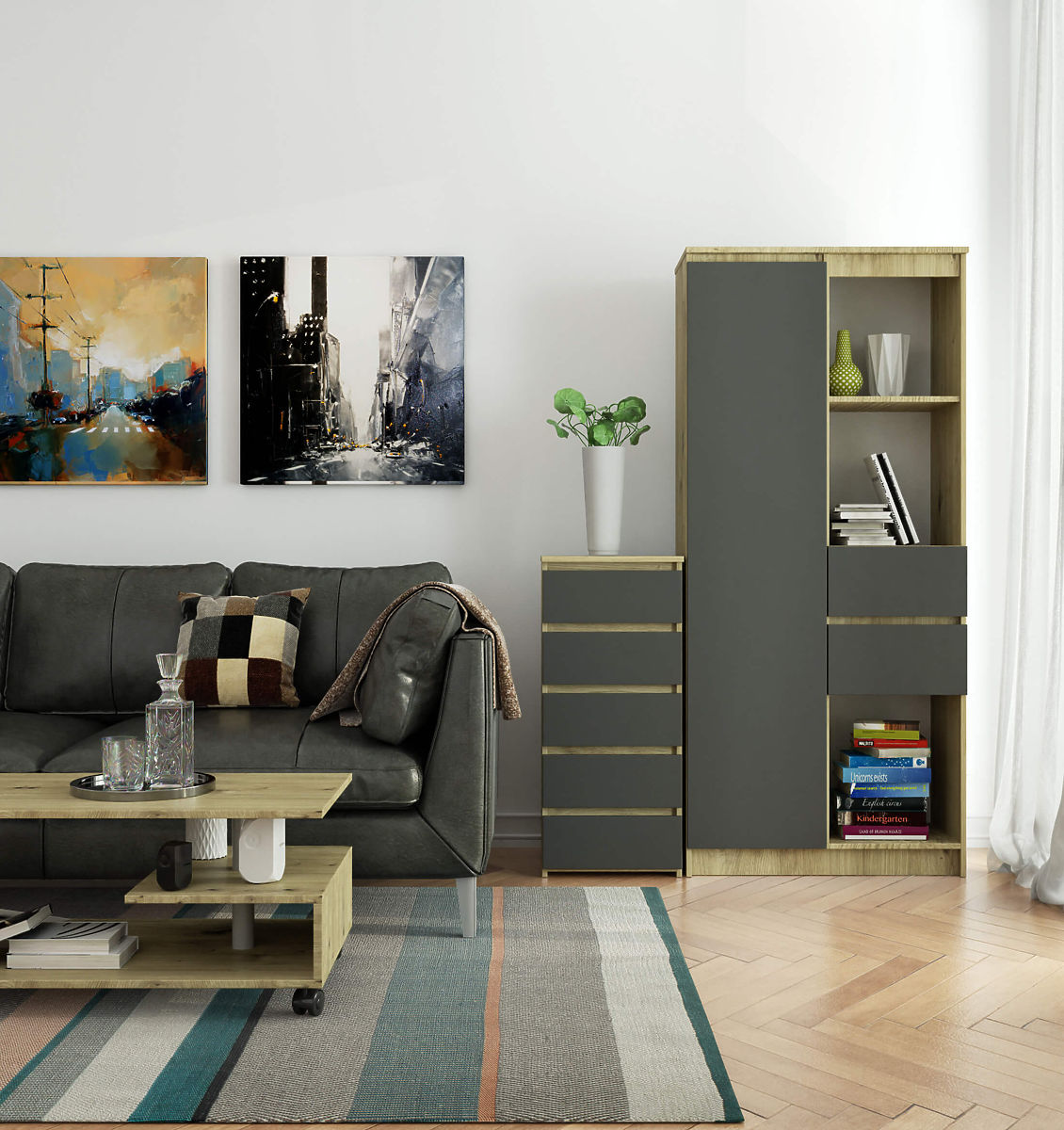 Chests of drawers are a popular type of furniture often placed next to the bed. A lamp is often found on its top, while inside are items that facilitate rest and sleep. People looking for an elegant chest of drawers should pay attention to the CL5 40 cm chest in artisan oak color with gray fronts. It will beautifully stand out in any bedroom. It can also be placed in a children's room.