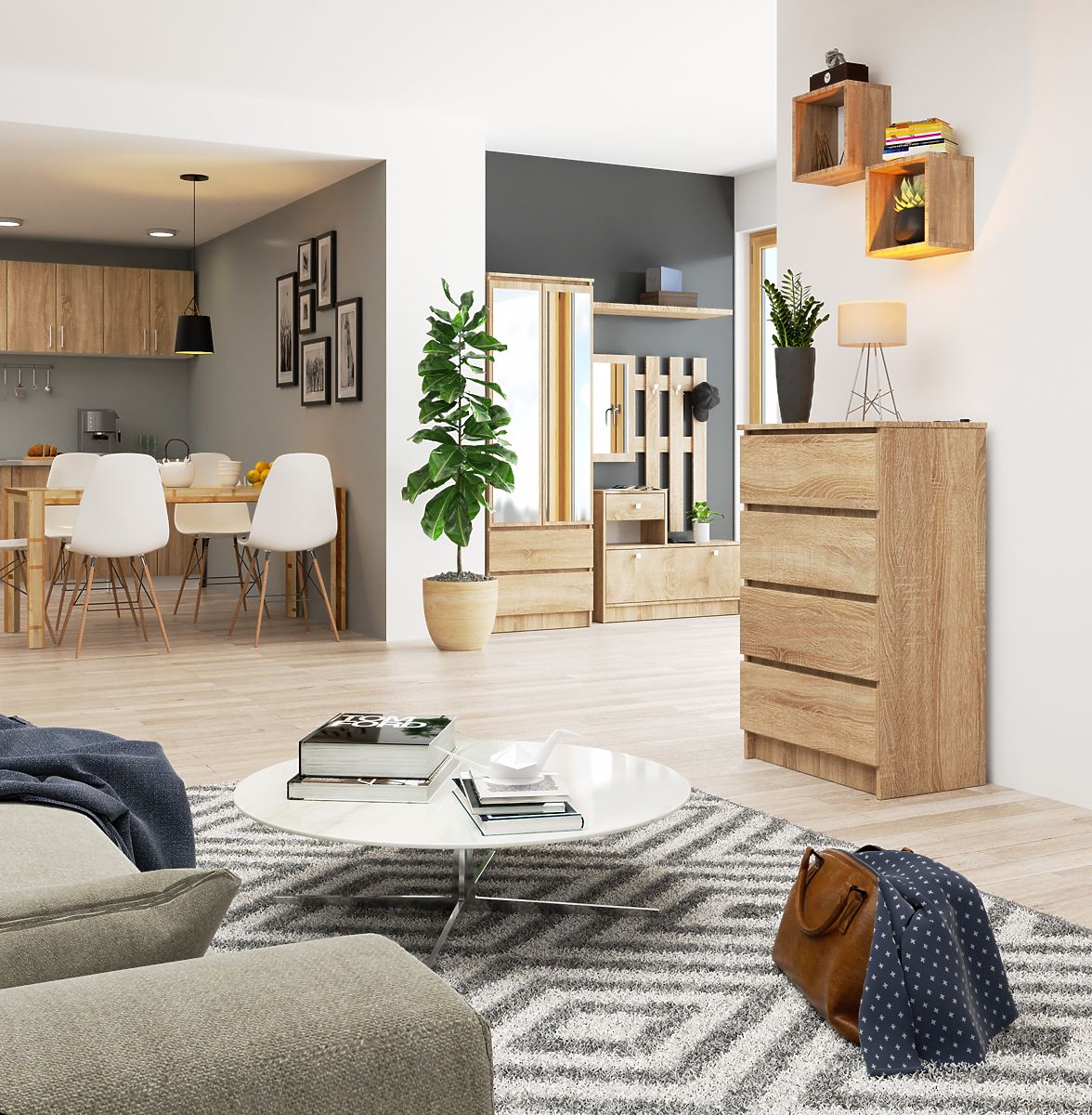 The small K60 chest of drawers is a design maintained in a fashionable, very popular color among customers. Of course, it is oak sonoma - a shade that fits perfectly into modern interiors, is very versatile, and combines wonderfully with all other colors. The chest of drawers itself is high-quality furniture equipped with four practical drawers. The design is intended for people who want to furnish their living room, bedroom, hallway, dining room, but also an office interior. High quality combined with a low price will surely convince customers who value simplicity and elegance in the best execution. You can match other furniture from the same collection to the chest of drawers, creating a dream arrangement of any chosen space.
