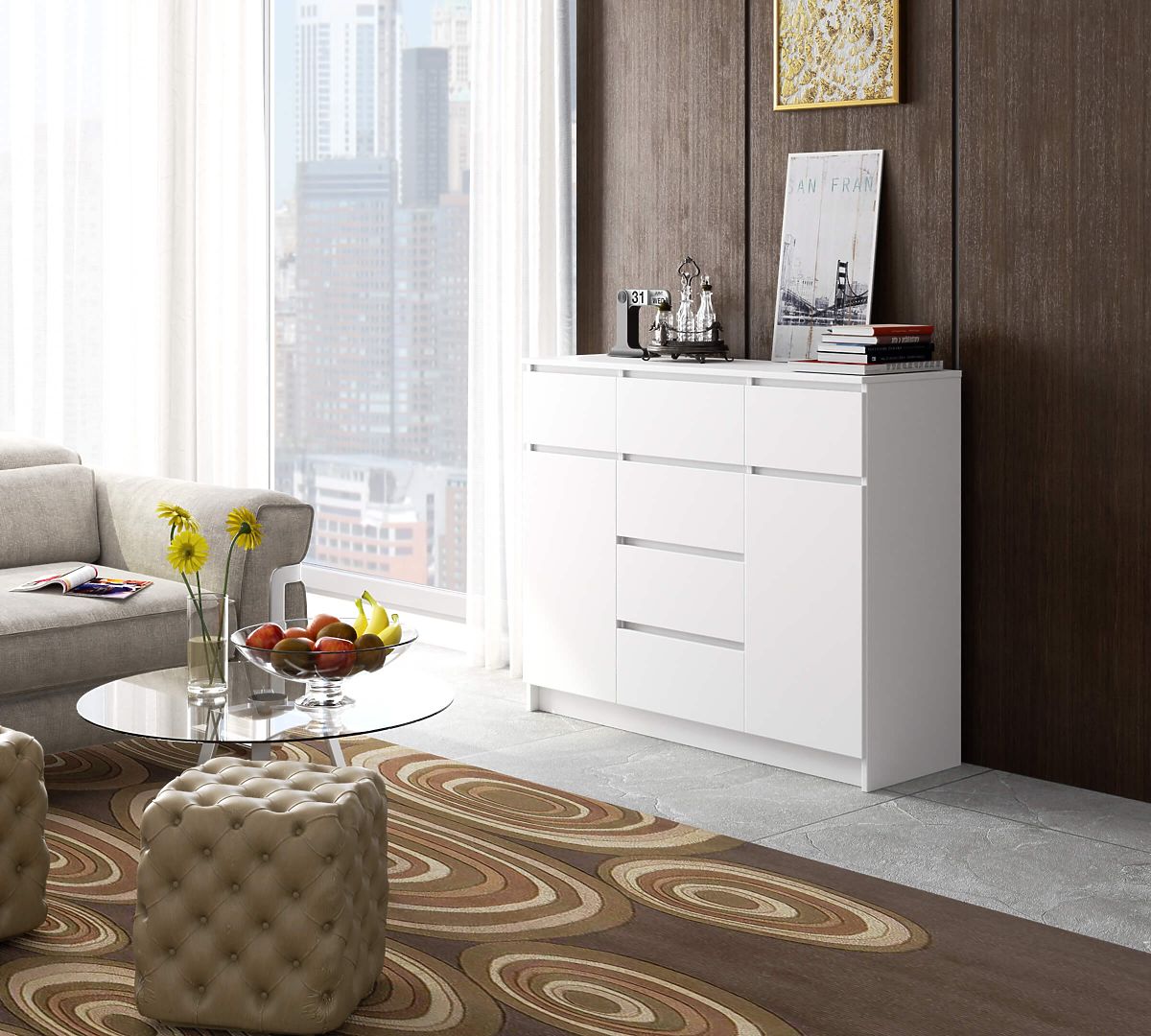 White chest of drawers with 6 drawers and 2 doors, made from laminated board. .. more