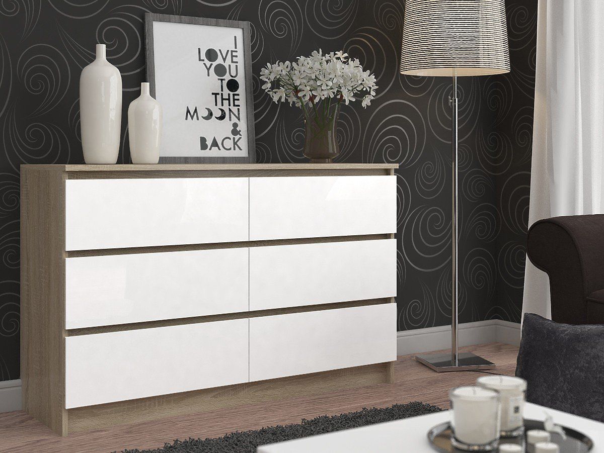Elegant, stylish, and modern. These three adjectives describe our chest of drawers. Finished in timeless colors. The body is in oak sonoma color, while the drawer fronts are white. The offer we provide to our customers has a length of 120 centimeters, a height of 77 centimeters, and a depth of 40 centimeters. The latter dimension makes our furniture so spacious. Of course, the six drawers for various accessories, clothes, and shoes also play a role. The aforementioned drawers move smoothly and precisely, all thanks to the metal ball runners.