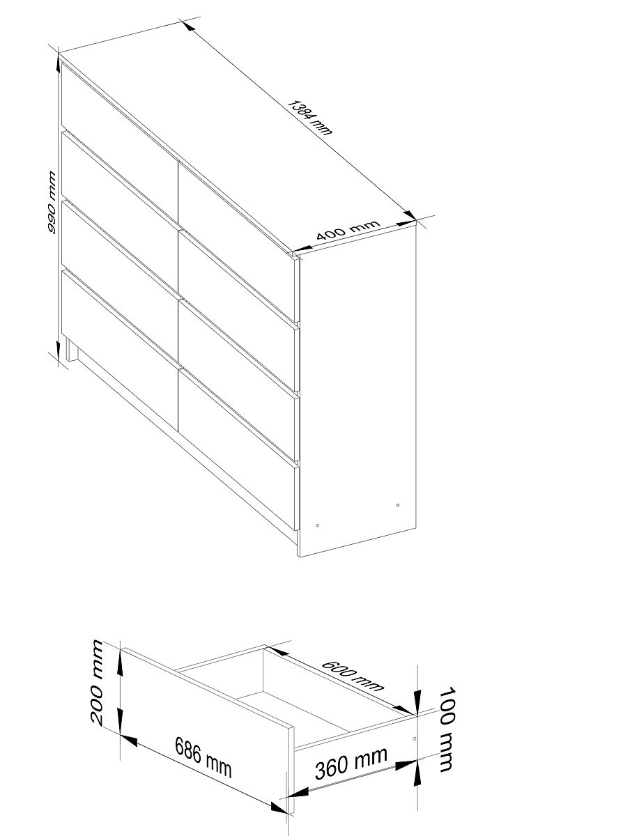 Depth - 40cm- Body of the chest made from 16mm white matte laminated board resistant to abrasion - Fronts made from 19mm ACRYLIC board in black high gloss finish