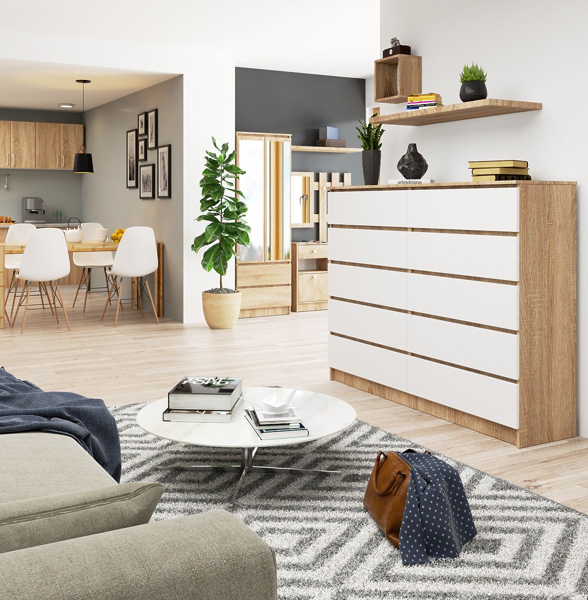 The chest of drawers is made from durable 16mm thick laminated board. The edges are finished with ABS edging, providing protection against scratches and all damage. It comes in a modern, Scandinavian oak sonoma color combined with white drawer fronts. Thanks to its universal style, it will perfectly fit into any interior and any room. You can place it in the bedroom, children's room, or even the living room. Oak sonoma imitates the grain of natural wood, adding extra charm to the furniture. The chest of drawers has a simple form, without legs.