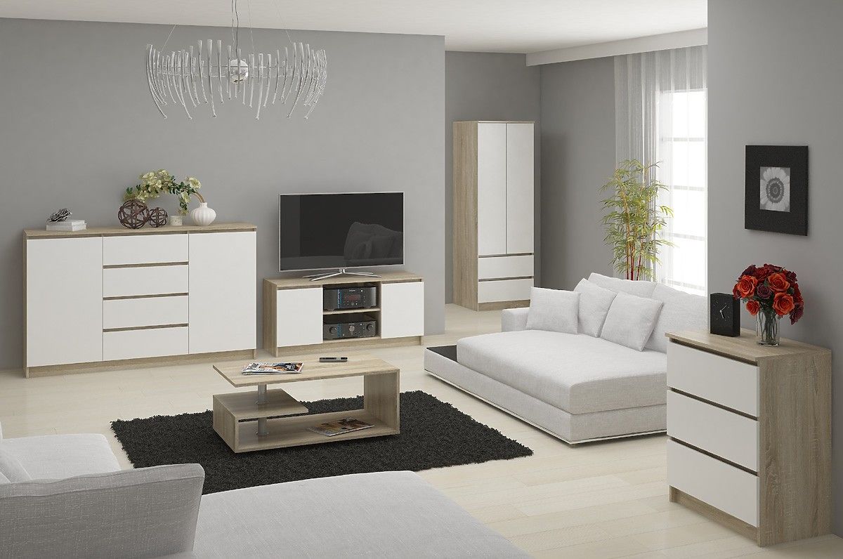 The chest of drawers is characterized by beautiful craftsmanship. It features a modern color combination that includes oak sonoma and white. Such a composition will be a good choice for bright and spacious interiors. It fits perfectly in the living room as a TV cabinet, as well as in the bedroom as a place for underwear or clothes. The model has the aforementioned length of 160 centimeters, a height of 77 centimeters, and a depth of exactly 40 centimeters. The chest of drawers is easy to clean thanks to its smooth surface.