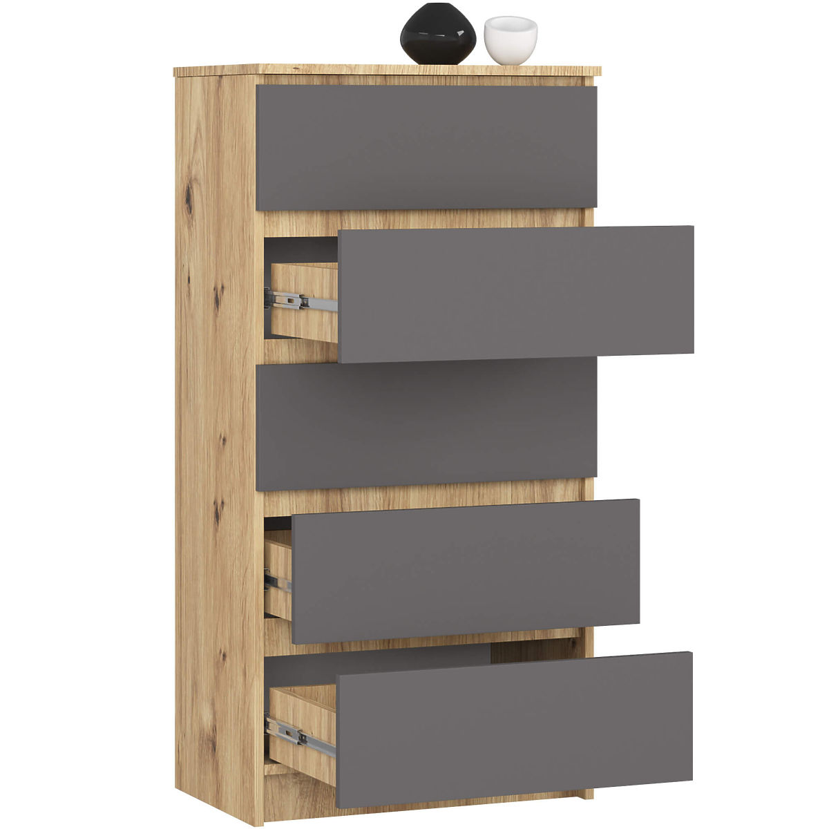 Five-drawer chest in Artisan Oak and Graphite Gray. .. more