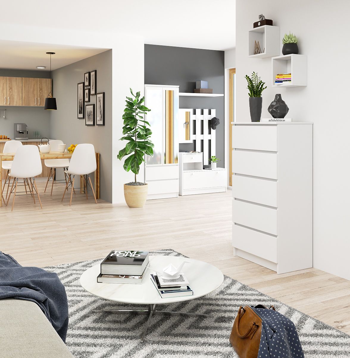 Timeless white is a color that continues to be appreciated by both lovers of traditionally furnished interiors and modern spaces. The tall white K60 chest of drawers is equipped with five drawers - an ideal choice for the hallway, dining room, bedroom, or living room. It can also be successfully used in offices, studies, or other rooms where there is a need to store a large number of items. Customers value this offer for its favorable price-quality ratio. Careful craftsmanship from durable materials is not the only advantage of the presented product. It is easy to clean, convenient to use, and also very effective, making it popular among customers visiting our online store.