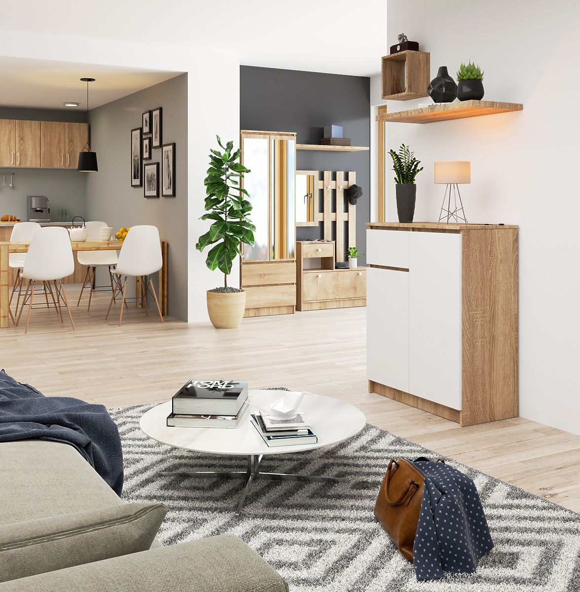 This small chest of drawers is a versatile piece of furniture suitable for any room. Its light colors, sturdy construction, and precise craftsmanship make it ideal for hallways, living rooms, children's rooms, or bedrooms. It can also be used in an office to store numerous documents and other office supplies. The chest consists of two closable cabinets (each with two shelves) and a drawer. The furniture combines trendy colors - white and oak sonoma.