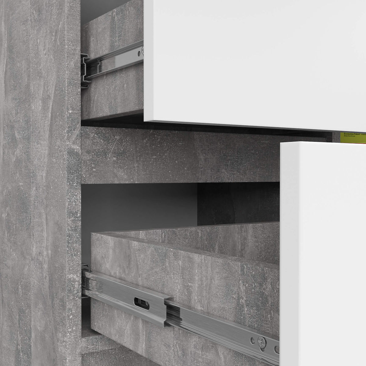 This small chest of drawers is a versatile piece of furniture that can be used in any room. Its modern colors, sturdy construction, and careful craftsmanship make it suitable for the hallway, living room, youth room, or bedroom. It can also be used in office spaces for storing numerous documents and other office supplies. The chest consists of one door (with two shelves inside) and 3 drawers. The furniture combines concrete and white colors.