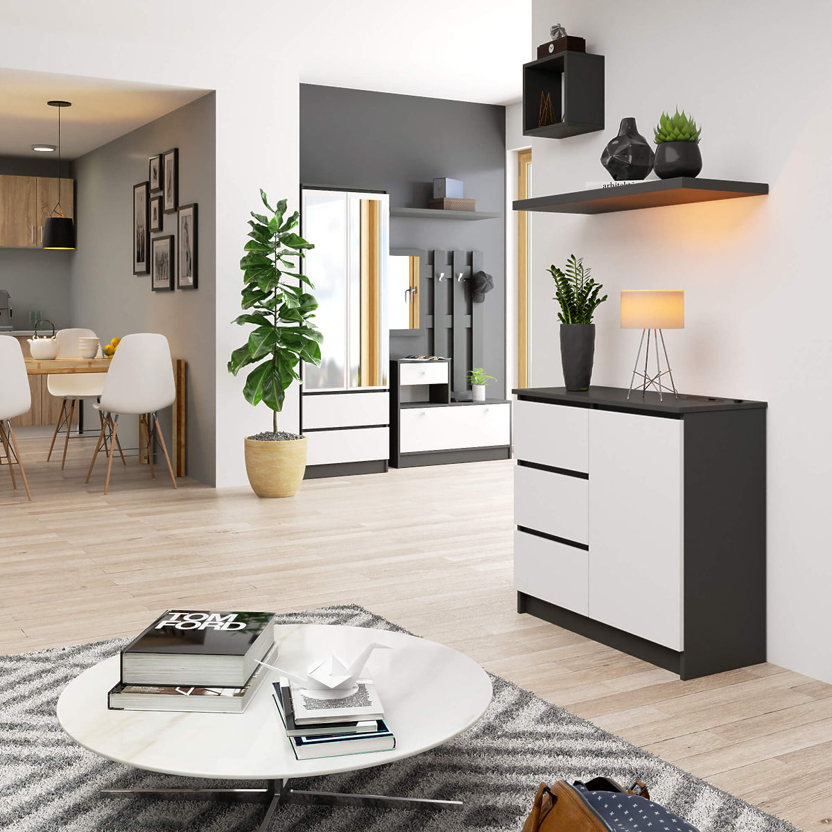 This small chest of drawers is a piece of furniture that can be used in any room. Its modern colors, solid construction, and careful craftsmanship make it suitable for use in a hallway, living room, children's room, or even a bedroom. It can also be used in an office space, providing storage for many documents and other office supplies. The chest consists of one door (with two shelves inside) and 3 drawers. The furniture combines graphite gray and white colors.