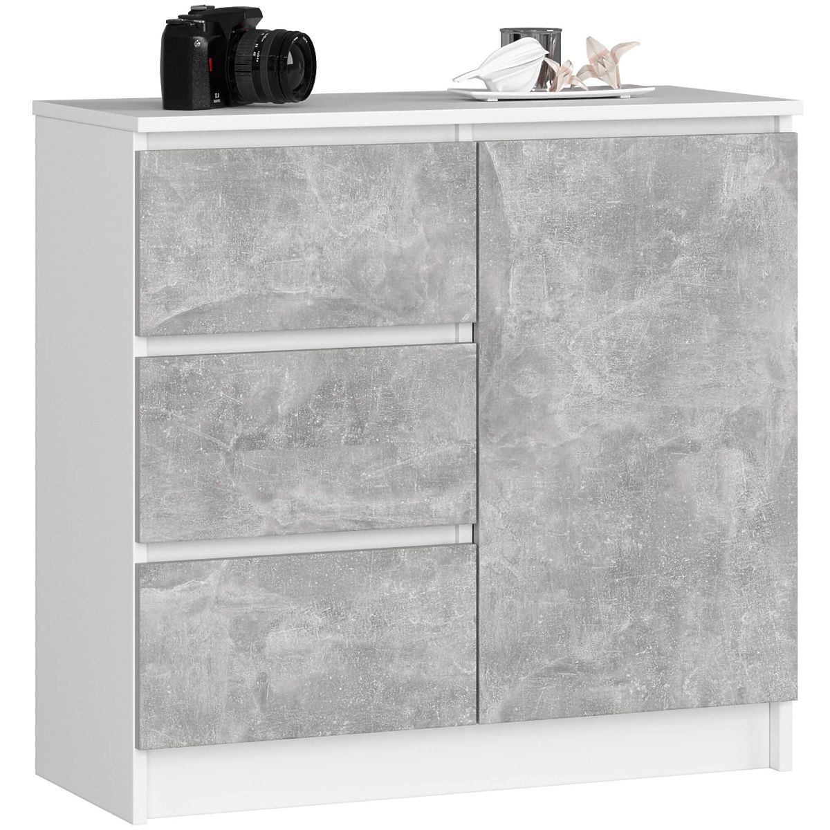 This small chest of drawers is a versatile piece of furniture suitable for any room. Its modern colors, sturdy construction, and meticulous craftsmanship make it ideal for use in hallways, living rooms, youth rooms, and bedrooms. It can also be used in office spaces for storing documents and other office supplies. The chest consists of one door (with two shelves inside) and 3 drawers. The furniture combines white and concrete colors.