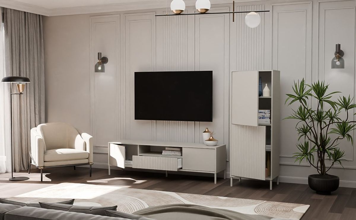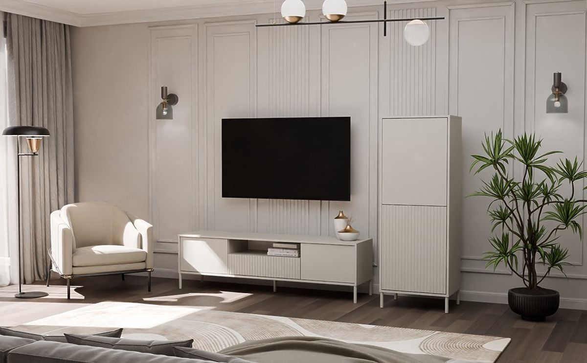 ELEGANCE AND PRACTICALITY IN ONEThe KAMARO 2DK SLIM/SMOOTH CASHMERE display cabinet combines aesthetics and functionality, making it a perfect fit for the living room, guest room, bedroom, or study. The combination of smooth front panel doors and grooved front panel doors reminiscent of louvers adds character, and the TIP-ON system allows convenient use without handles. The furniture provides ample storage space while being a stylish element in a modern interior.