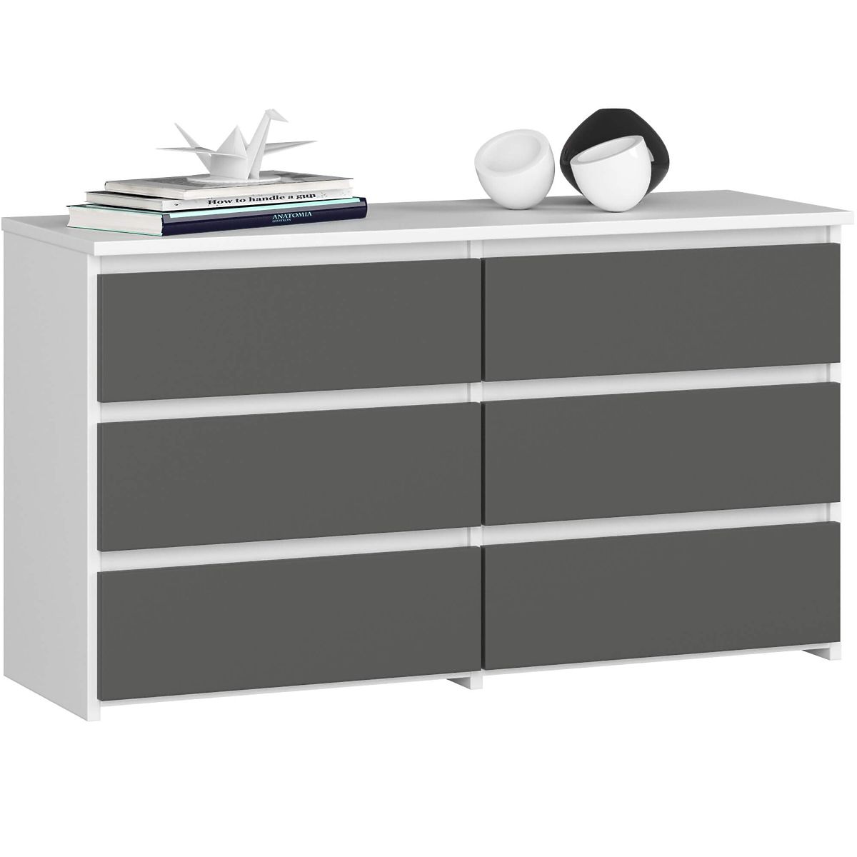 In furniture making, special emphasis is placed on the functionality of products and their high aesthetic values. A great example is the CL 100 cm dresser. This practical piece of furniture is made from abrasion-resistant laminated board, ensuring its durability and resistance. The six spacious drawers can accommodate various books, documents, or small items. Some of our customers choose to store clothes or underwear. The white dresser with graphite gray fronts has an elegant design. Its simple form and elegant execution fit both classic and elegant interiors as well as romantic ones. This exceptional piece of furniture presents itself perfectly in an elegant living room or cozy bedroom. It is also used as part of a wardrobe or hallway. The 6-drawer dresser is appreciated by individual customers and entrepreneurs alike. Thanks to its flawless appearance and incredible capacity, it is perfect as part of office equipment.