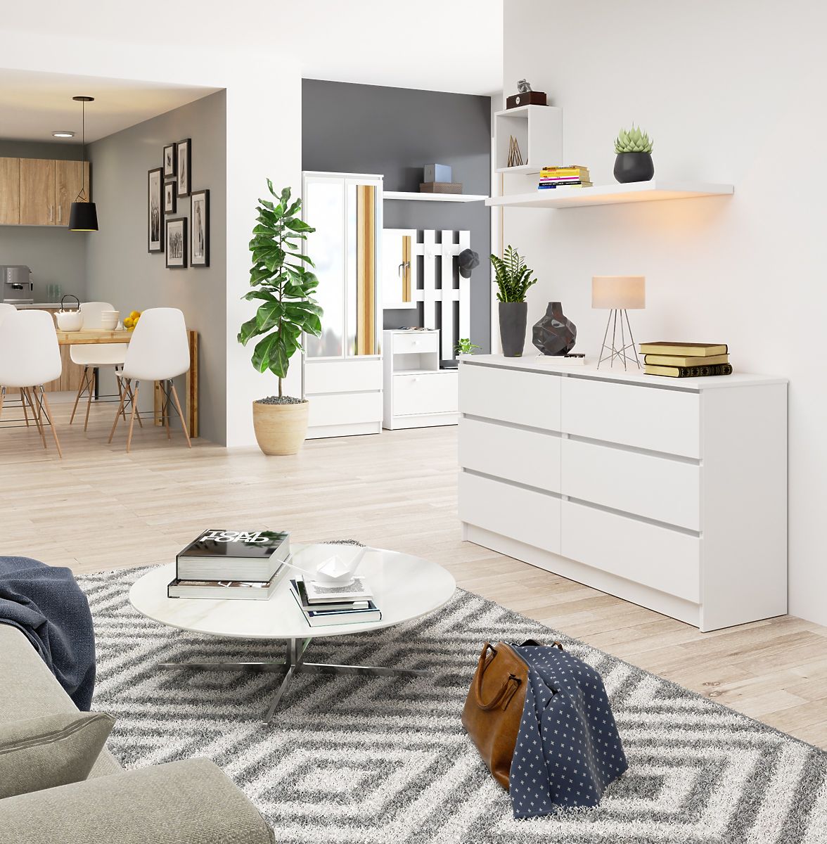 DRESSER K140 6 DRAWERS is a piece of furniture that is simple and minimalist in form. It fits perfectly in rooms with modern and Scandinavian design, where light colors dominate. This white furniture is suitable for the living room, bedroom, hallway, but also for the office or study. Its height is 77 cm, length 140 cm, and depth 40 cm.