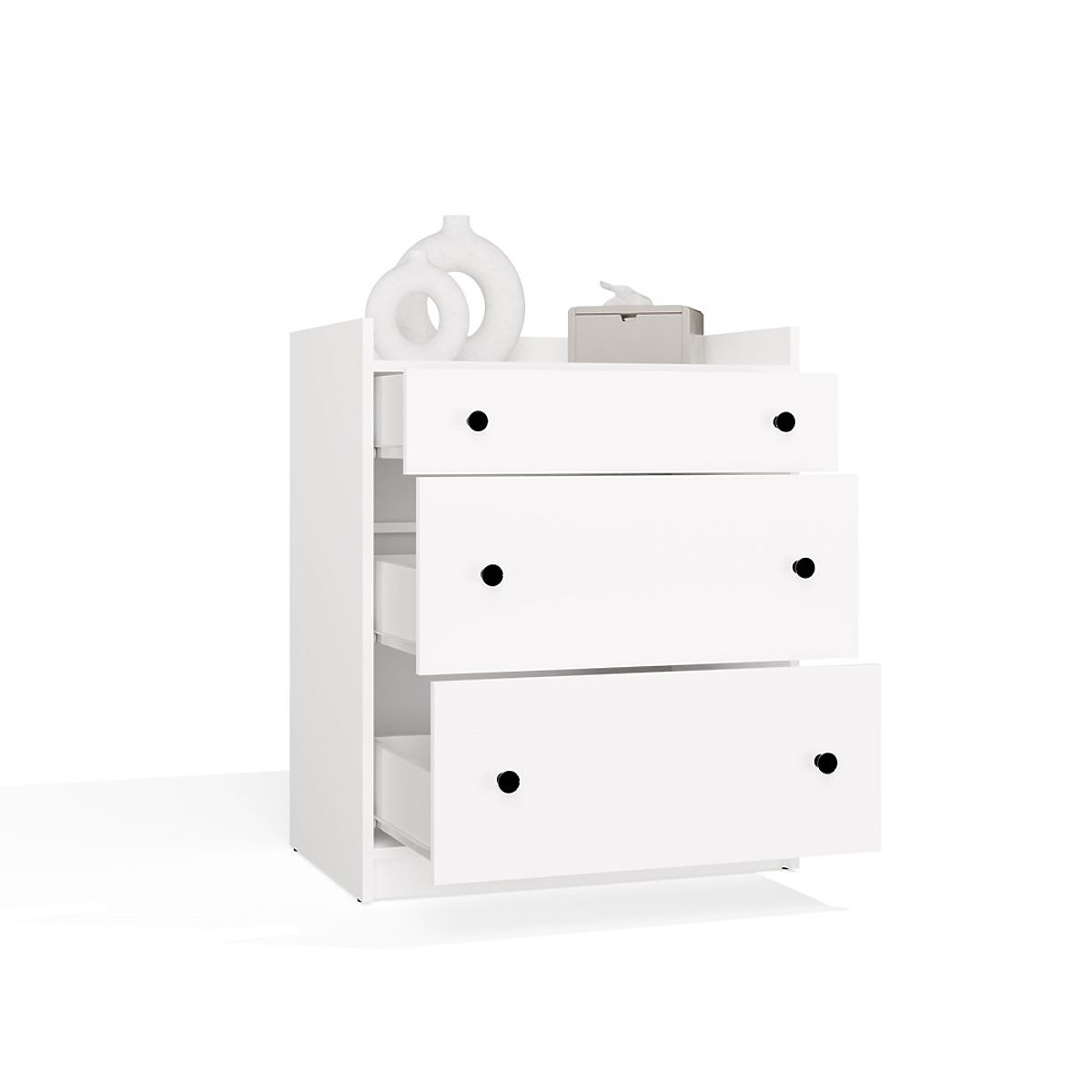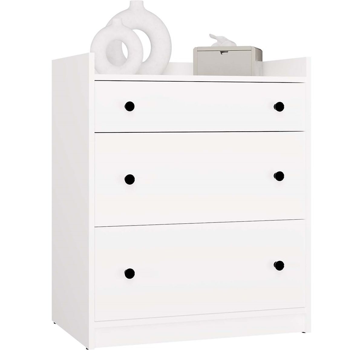 White dresser with 3 spacious drawers and black metal handles. .. more