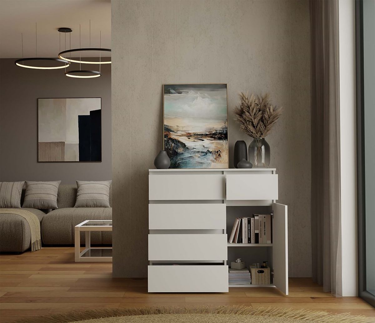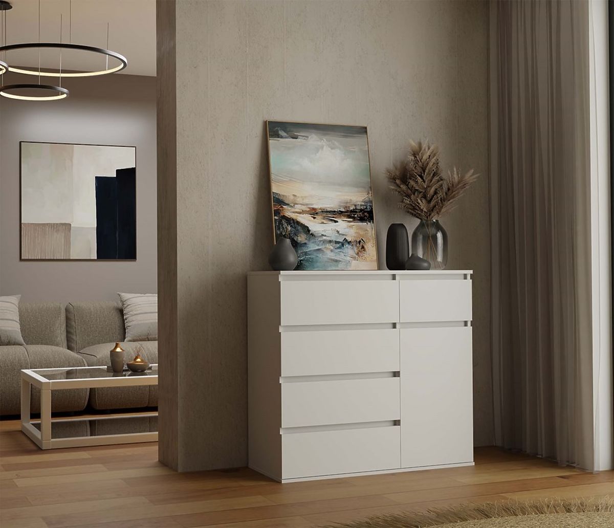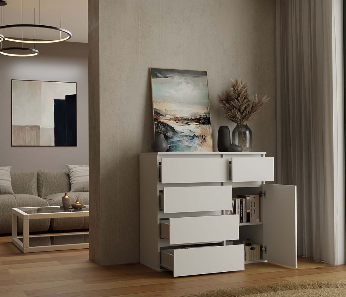 White dresser with 1 door and 5 drawers for versatile storage. .. more