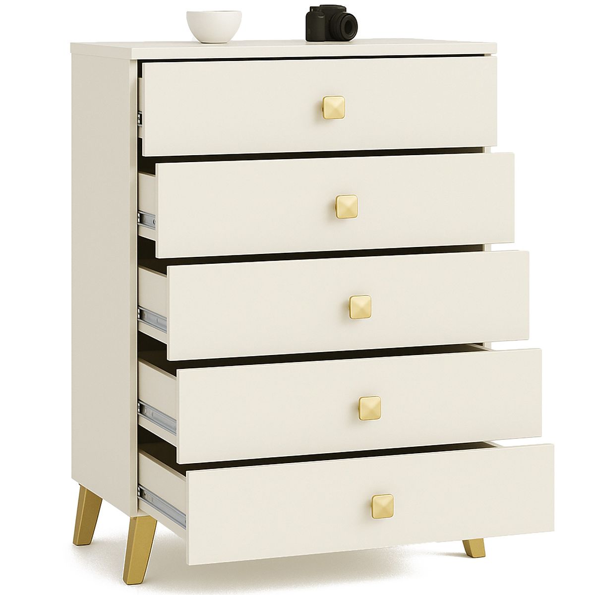 This small chest of drawers is a versatile piece of furniture suitable for any room. Its modern colors, sturdy construction, and meticulous craftsmanship make it ideal for the hallway, living room, children's room, or bedroom. It can also be used in office spaces for storing numerous documents and other office supplies. The chest consists of 5 drawers and combines cashmere and gold colors.