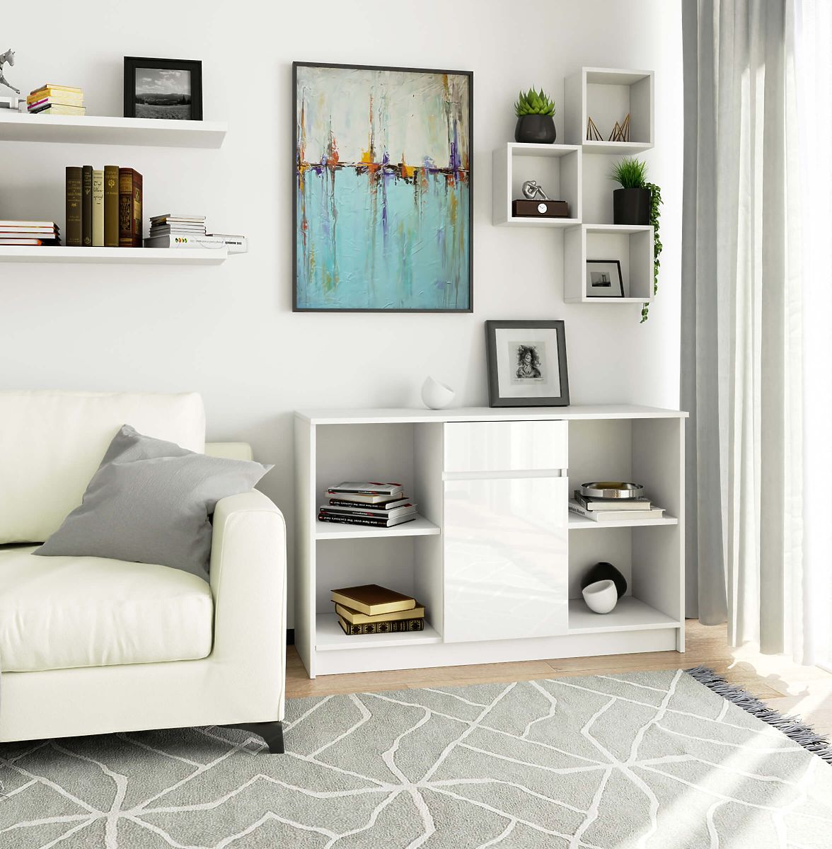 White gloss sideboard with modular design and storage options. .. more