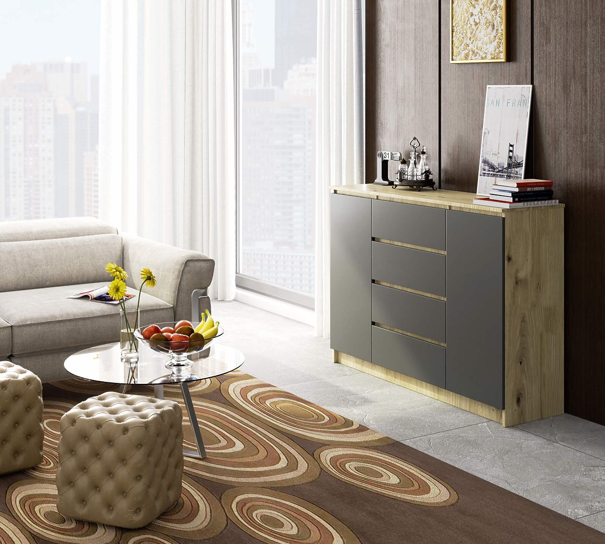 Sideboard with 2 doors and 4 drawers in Artisan Oak and Graphite Gray. .. more