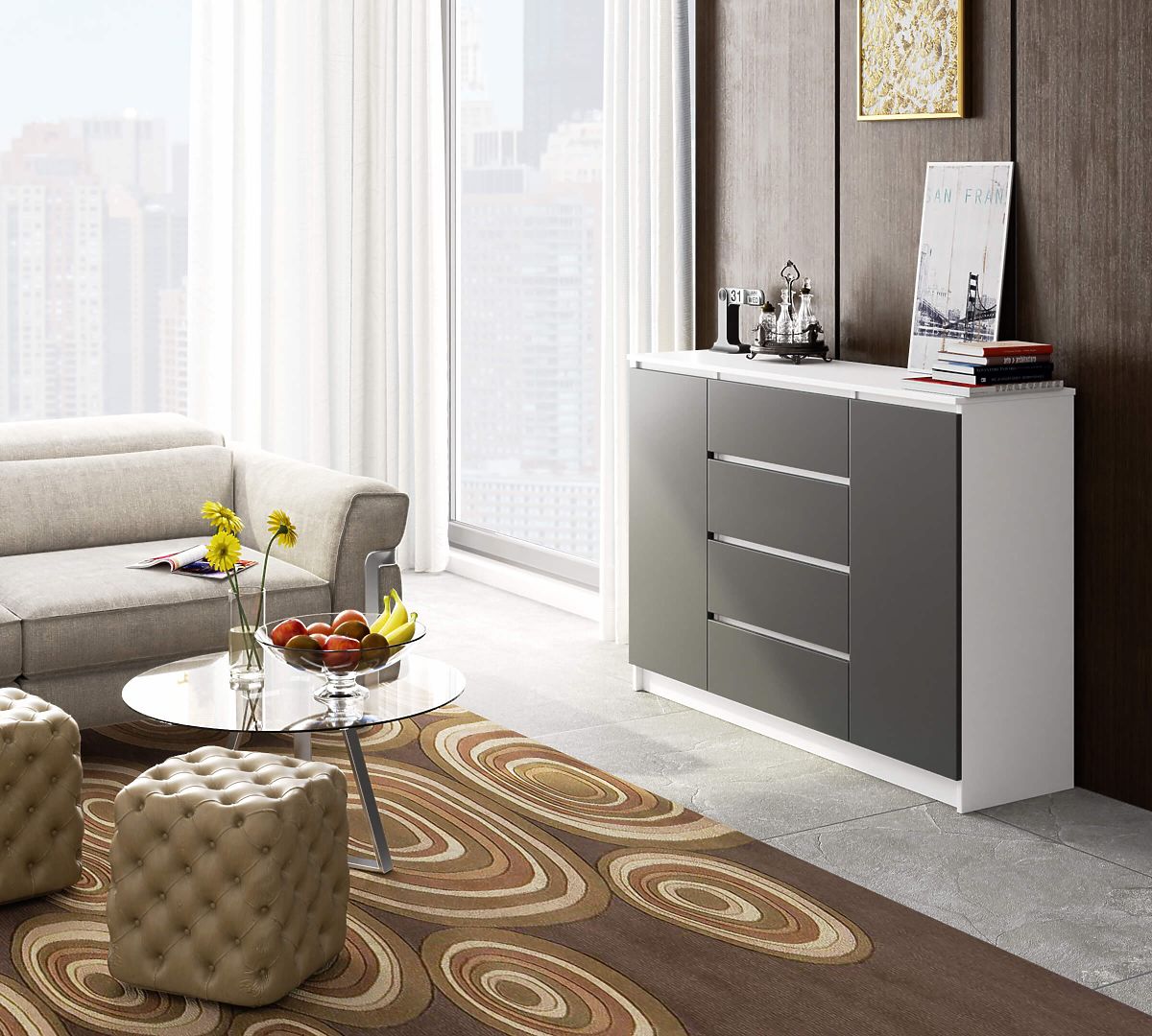 Sideboard with 2 doors and 4 drawers in white and graphite gray. .. more