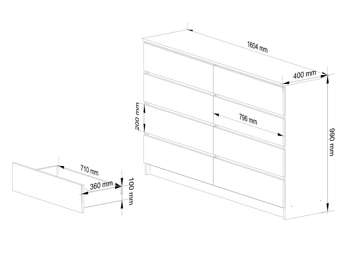 SIDEBOARD K 160 cm 8 DRAWERS Made from 16 mm abrasion-resistant laminated board.