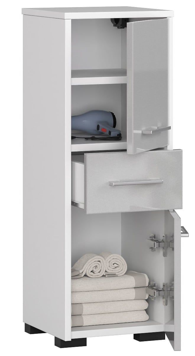 The FIN bathroom column with a drawer and two flip doors is made of high-quality, abrasion-resistant Kronospan laminated furniture board. The white body of the furniture perfectly matches the fronts with a high-gloss acrylic surface in a metallic color. Under the column board, there is a cabinet with two shelves and doors. Below is a drawer and another cabinet – this time with one shelf. The elegant bathroom cabinet is complemented by interesting, comfortable, and simple handles.