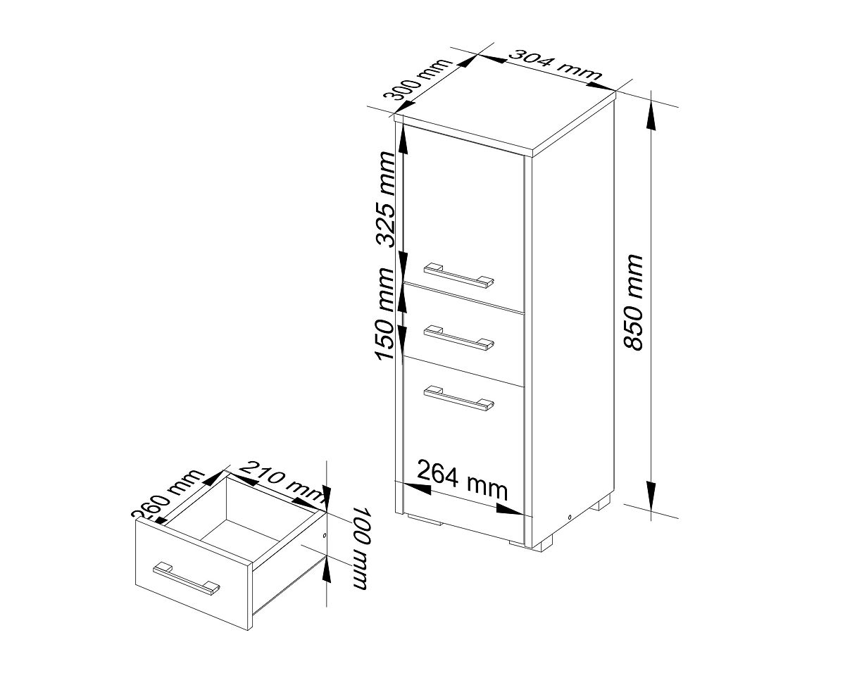 The high humidity in the bathroom means that the furniture placed there must be exceptionally durable. The presented bathroom cabinet-column FIN 2D 1SZ is made from a 16 mm thick laminated board by Kronospan. The edges are finished with an ABS edge. This makes the cabinet resistant to scratches, mechanical damage, and moisture. The cabinet is a very versatile piece of furniture. The set includes both adjustable hinges for hanging and legs for placing the cabinet on the floor. The lower part of the shelf is a closed space, ideal for storing towels. Inside the upper doors, there is one shelf for organizing cosmetics. The middle part of the column is occupied by a pull-out drawer. The furniture is made in Oak Artisan color, and its doors are adorned with silver handles.