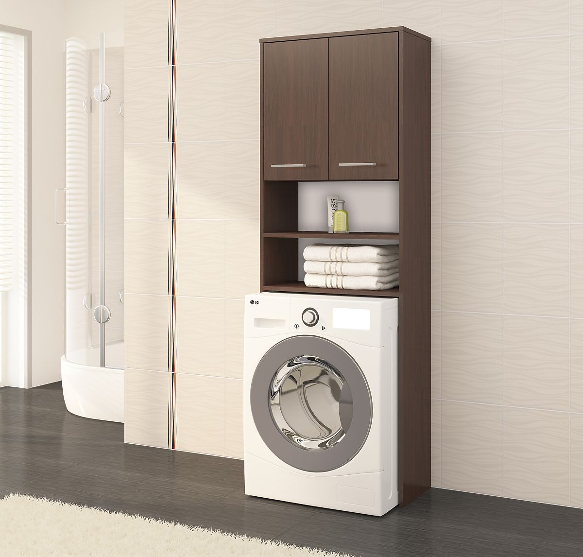If we have a small bathroom, we don't have to give up furniture to store hygiene products or towels. Optimally designed furniture, like a bathroom cabinet over the washing machine, makes the room exceptionally functional. This furniture, consisting of a cabinet at the top and shelves below, is a good way to utilize the space above the washing machine. We can easily store all kinds of liquids, boxes of washing powders, or detergents in the cabinet. Practical accessories and cosmetics find their place on the shelves. It's furniture that allows us to create a very stylish bathroom. Its excellent, classic color contributes to this. The wenge shade gives it an elegant style. The depth of the cabinet ensures it won't obstruct even in rooms with very limited space. Its thoughtful design and shape also ensure this. To keep the cabinet over the washing machine looking neat for as long as possible, it is made from durable material. The laminated board is abrasion-resistant and guarantees the great durability of this furniture.